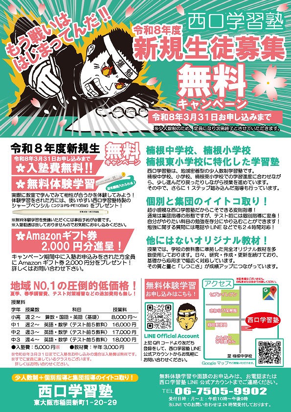 東大阪市立楠根中学校、楠根小学校、楠根東小学校を対象とした学習塾です。